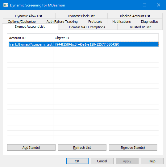 使用此页面来列出您希望豁免“动态屏蔽”的账户阻止选项的任何账户。